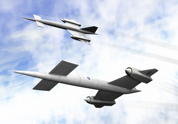 During 1951 the British Government under Winston Churchill became worried at the bomber gap developing between the RAF and the Soviet Union. Also, intelligence reports indicated the USSR was planning a massive action of an unspecified nature in 1953. With these thoughts in mind the RAF was asked to consider the use of "flying bombs" made from plastic as the primary weapon of Britain's nuclear strike force. Bristol Aircraft designed the Type 182 (codename "Blue Rapier") which was entering the testing phase when it was cancelled in 1953, much to the relief of the RAF who wanted a new manned bomber. The new bombers were the Vulcan, Valiant and Victor.