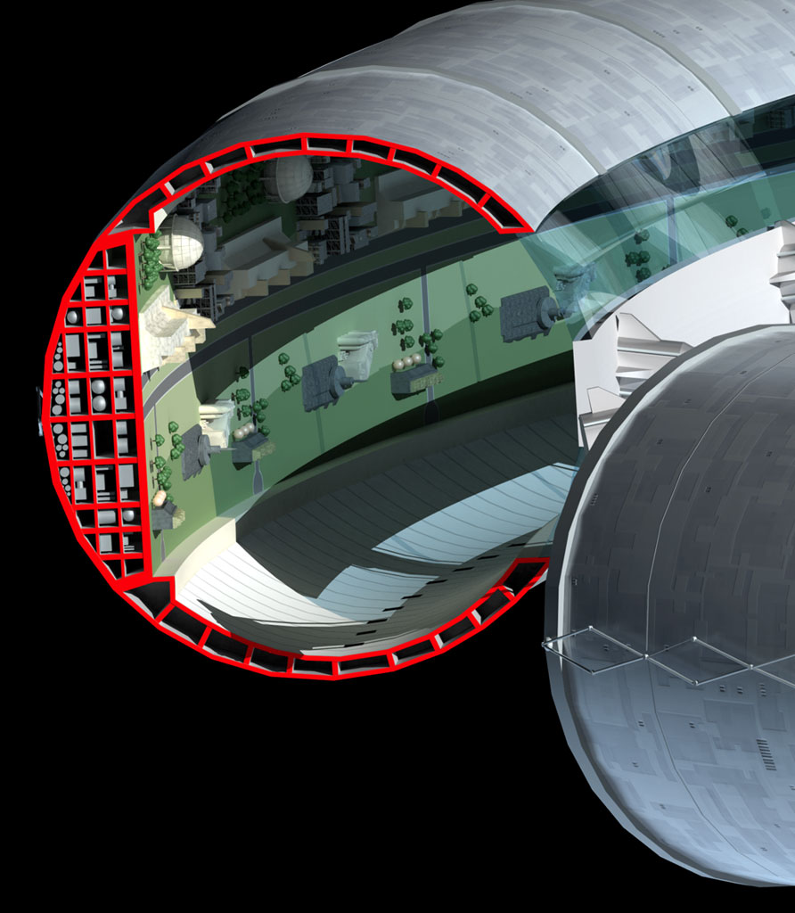 The ring is connected to a hub via a number of "spokes", which serve as conduits for people and materials travelling to and from the hub. Since the hub is at the rotational axis of the station, it experiences the least artificial gravity and is the easiest location for spacecraft to dock. Zero-gravity industry is performed in a non-rotating module attached to the hub's axis. The interior space of the torus itself is used as living space, and is large enough that a "natural" environment can be simulated; the torus appears similar to a long, narrow, straight glacial valley whose ends curve upward and eventually meet overhead to form a complete circle. The population density is similar to a dense suburb, with part of the ring dedicated to agriculture and part to housing.